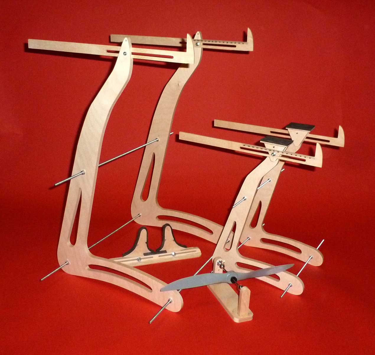 Sehr stabile Konstruktion, da die Seitenteile mit Gewindestäben verbunden werden und dadurch ein seitliches Schaukeln minimiert wird. Noch nicht ausgewogene Flieger kippen nicht ab und fallen runter, sondern werden auf der Winkelscala abgefangen. So bleibt genug Zeit um z.B. etwas Trimmblei zu holen. In Verbindung mit dem Motorprüfstand als Halterung einer Zugwaage geeignet.