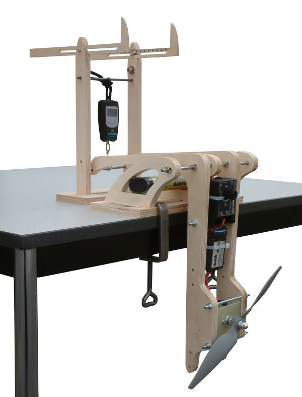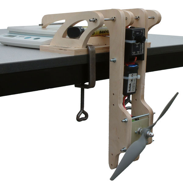 Schätzen Sie noch, oder wissen Sie schon??? Abgesehen davon, das z.B. das das Zugkraft messen eines in einem Segler eingebauten Motors fast unmöglich ist, bräuchte man zu messen der anderen Parameter 5 Hände. Zwei halten das Modell, eine bedient die Fernsteuerung, eine hält das Messgerät vor die Luftschraube und die andere Hand bedient das Gerät. Und dabei immer auf die drehende Luftschraube achten. Wird der Prüfstand auf einem Stuhl oder Tisch (z.B. auf dem Flugplatz) festgeschraubt oder mit Zwingen befestigt kann man die Messungen ganz in Ruhe durchführen. Mit nur zwei Händen. Eine für den Fernsteuerknüppel und eine für das Gerät, und das ganze immer im sicheren Abstand zu Luftschraube.