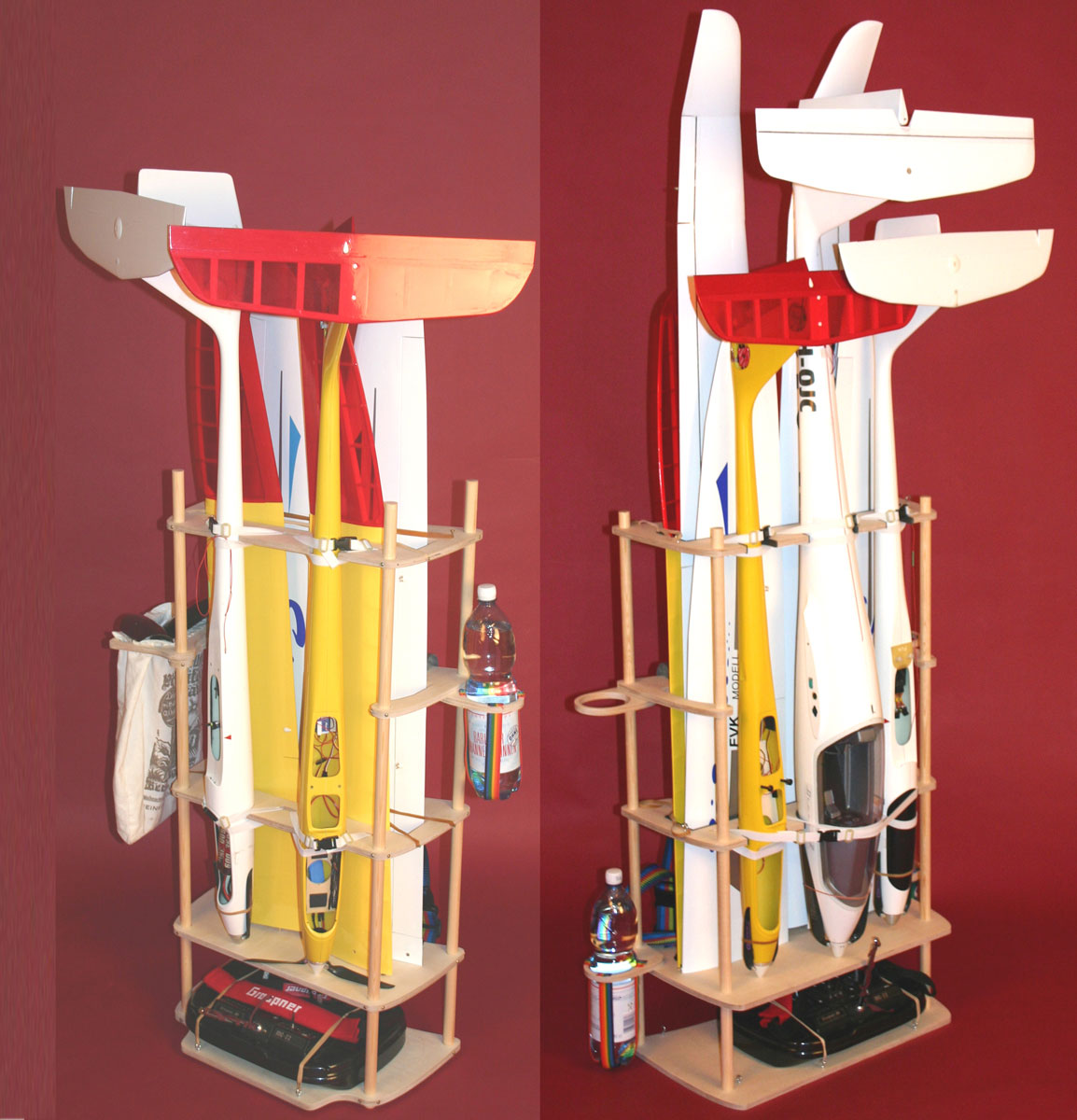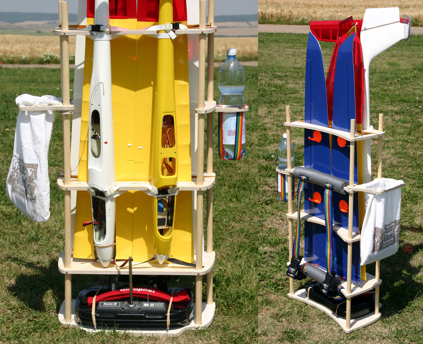 Das Gestell dient dem leichten Transport eines oder mehrerer Modelle inklusive der Fernsteuerung auf dem Rücken. So können Berge oder Fluggelände erreicht werden, wo eine Anfahrt mit dem Auto nicht möglich ist. Die Modelle können auf dem Gestell montiert und abgelegt werden. Das Gestell ist auch ideal als Lagergestell nutzbar.